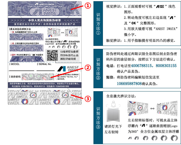 2015年起開始出貨的噴槍包裝盒上粘貼了新的防偽標簽,比2013年7月份的新防偽標簽添入了最新的防偽辨識。于此詳細說明標簽的識別方法。