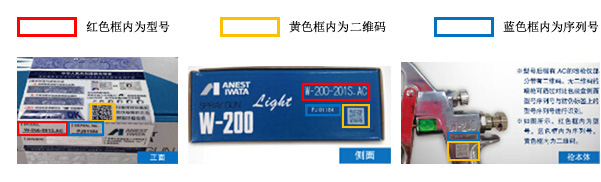 型號后綴有.AC的噴槍僅部分帶有二維碼。無二維碼的噴槍可通過對比包裝盒側盒型號序列號與防偽標簽上的型號序列號進行識別。