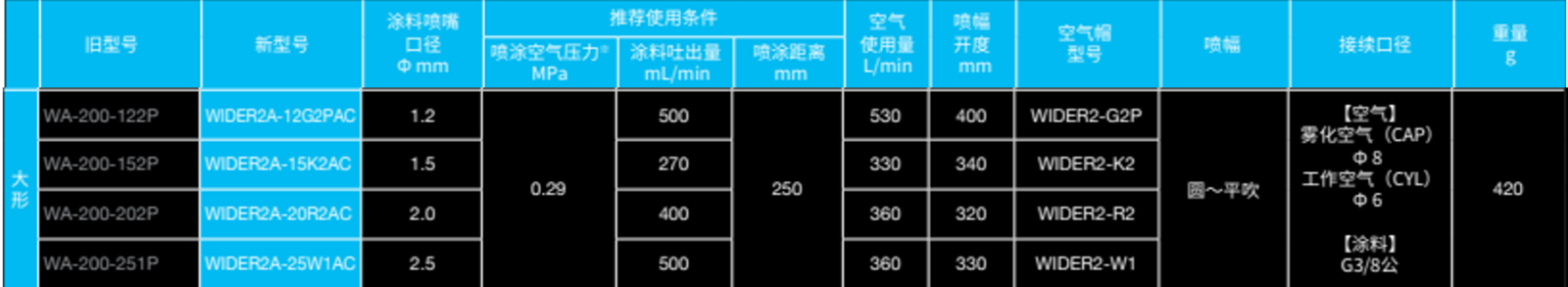 在工業涂裝產品最重要的是【品質和穩定性】。針對多用途和進行化的涂料,我們制造出了最適應這種變化的最合適的噴槍。WA-101上市至今已有14年、WA-200上市至今已有23年,從那時起積累的經驗全部傾注于“WIDER”上。從庸俗的設計到錘煉過的精益設計,提升了維護性能進而了更高品質的新一代噴槍。