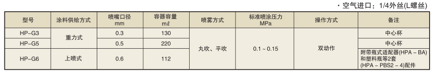 ·有3種噴嘴尺寸不同的機型:重力式(HP-G3/G5),吸取式(HP-G6)。 ·可進行平噴·丸吹兩種噴幅的噴涂。 ·采用噴槍外形,可提高操縱性。 ·噴嘴、中心料杯(HP-G3/G5)的材質為防銹性強的不銹鋼。 ·HP-G3,G5機身用微光鍍鉻進行處理,非常雅致。 * 即使是小型空壓機,在空氣不足時粒子也會變粗。 建議使用2缸或125W以上的空壓機。