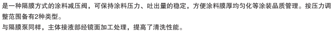根據壓力調節范圍不同,備有2個產品系列。與隔膜涂料泵相同,在主體接液部位實施了鏡面精加工,提高了沖洗性。