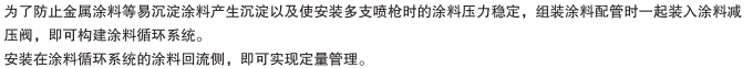 如果與涂料減壓閥一起安裝到涂料配管中,可以構(gòu)筑涂料循環(huán)系統(tǒng)。在涂料循環(huán)系統(tǒng)的涂料返回側(cè)安裝,可進(jìn)行定量管理。
