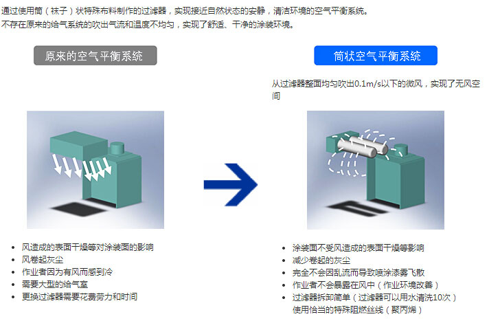 通過使用筒(襪子)狀特殊布料制作的過濾器,實現接近自然狀態的安靜,清潔環境的空氣平衡系統。