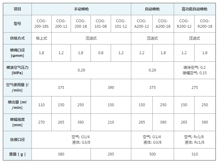 ?COG-200(吸上式) ?COG-200(壓送式) ?COG-A200(自動噴槍) ?COG-R200(高功能自動噴槍) ?COG-101(小型,壓送式)