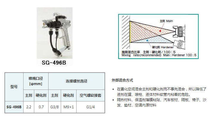 本噴槍減輕了粘著現(xiàn)象,噴涂時(shí)可主劑和硬化劑混合噴霧。