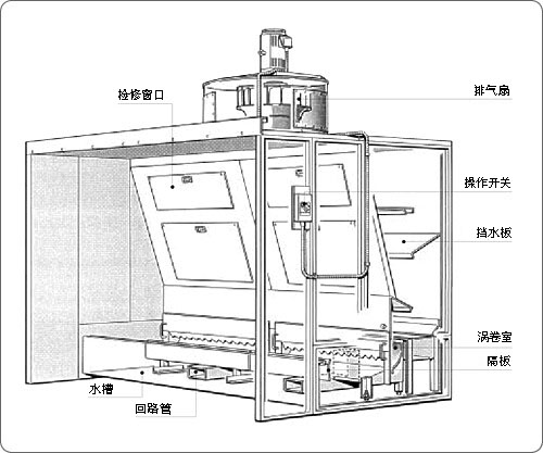 然后,涂料霧和水通過回路管返回到水槽前面。