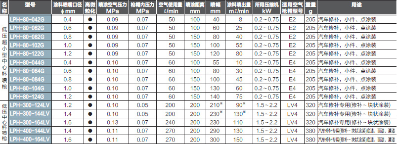 分涂料等也可以噴涂成均勻涂面。 環(huán)保型噴槍 LPH-300/400型是高噴涂效率,低飛濺的環(huán)保型低空氣量,