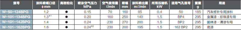 W-50-124BPG:小面積修補(bǔ)噴涂專用 KIWAMI-1-13B4:金屬漆和珍珠漆專用,防止黑點(diǎn)產(chǎn)生 KIWAMI-1-14B2:滲透性優(yōu)良,清漆和固體漆專用 KIWAMI-1-16B2:涂底油漆工專用