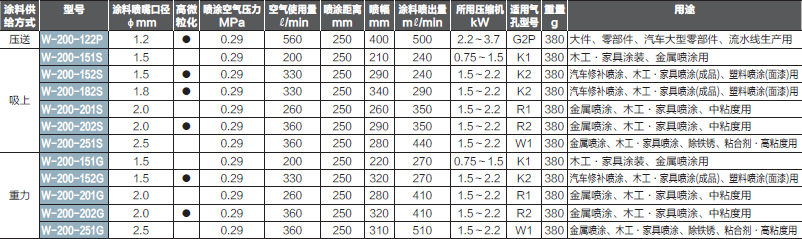 生產線噴涂用的W-200-122P具有高微粒化噴幅,便于涂裝操作。W-200-182S作為新機種,適用于汽車修補,木工等各種用途。